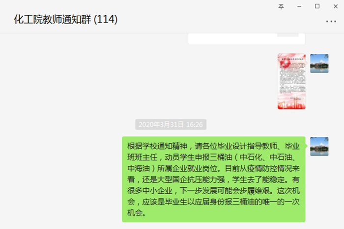 注重提高申报“三桶油”比例,助力学校抢占传统就业市场。根据党中央和国务院的统一安排,我国三大石油公司(也称三桶油)用工岗位有所扩招。学校本科教育大会提出了“重回油田”的思路,化工院党委认真贯彻落实,并加强对学生的教育和引导,为学生介绍三大石油公司的发展前景和所属企业的实力,介绍了国企的优势,从而激发了同学们的就业意愿。在全体教师的积极动员和广大校友的帮助下,截止目前,学院共40余名毕业生报名参加了三大石油公司的招聘,部分学生已经收到面试通知,个别同学已经准备与企业签署就业协议。
