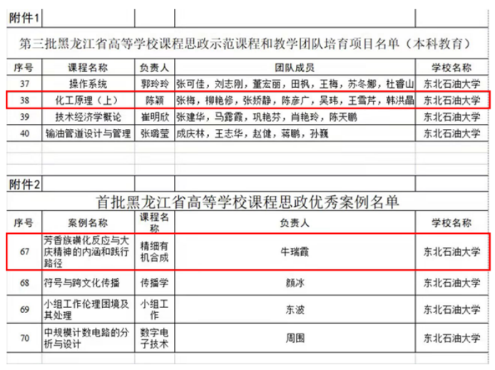 (通讯员 张梅)近日,黑龙江省教育厅发布了《关于黑龙江高校第三批课程思政示范培育项目、首批课程思政优秀案例、首批外语专业“三进”示范课程和教学团队建设点名单的公示》,东北石油大学4门本科课程入选第三批黑龙江省高等学校课程思政示范课程和教学团队培育项目,4个教学案例获批首批黑龙江省高等学校课程思政优秀案例,化学化工学院陈颖教授负责的《化工原理(上)》课程思政示范课程和教学团队培育项目与牛瑞霞副教授负责的《精细有机合成》课程“芳香族磺化反应与大庆精神的内涵和践行路径”思政优秀案例榜上有名。