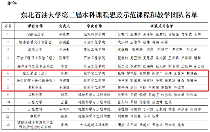 毛国梁教授负责的《有机化学》和关淑霞副教授负责的《分析化学(含仪器分析)》在东北石油大学第二届本科课程思政示范课程和教学团队评选中,被认定为校级课程思政示范课程和教学团队。