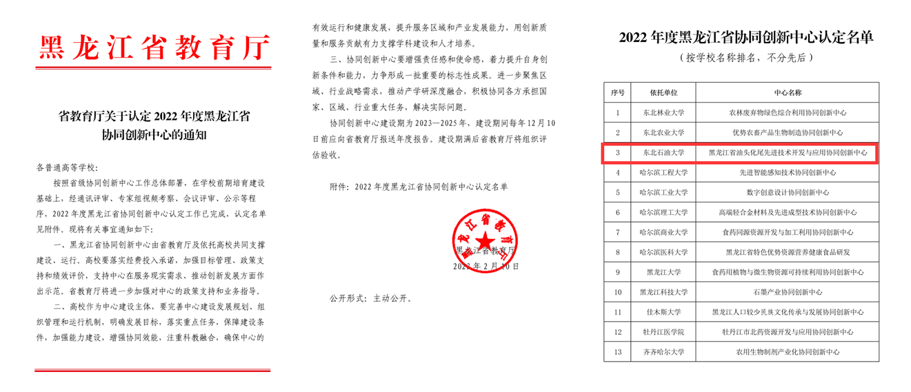 由我校牵头,大庆师范学院、大庆化工研究中心、大庆采油工程研究院、大庆石化公司和大庆炼化公司五家单位参与共建的“黑龙江省油头化尾先进技术开发与应用协同创新中心”于2023年2月通过黑龙江省教育厅认定。协同创新中心依托于化学化工学院化学工程与技术省优势学科和1个国家研发中心、4个省级重点实验室、5个中试基地等科研平台,聚焦油头化尾领域,在化工新工艺、新型催化剂、高附加值化工产品和化工新材料等优势方向进行基础创新研究和关键技术开发,助推国家石化产业发展。