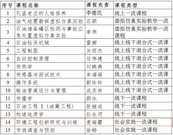 4月11日教育部公示第二批国家级一流本科课程认定结果,我校15门课程入选,其中线上课程1门,线下课程3门,线上线下混合式课程7门,虚拟仿真实验教学课程2门,社会实践课程2门。我院袁瑞霞教授负责的《环境工程创新研究与训练》课程获社会实践一流课程。截至目前,我院已有国家级一流本科课程2门。