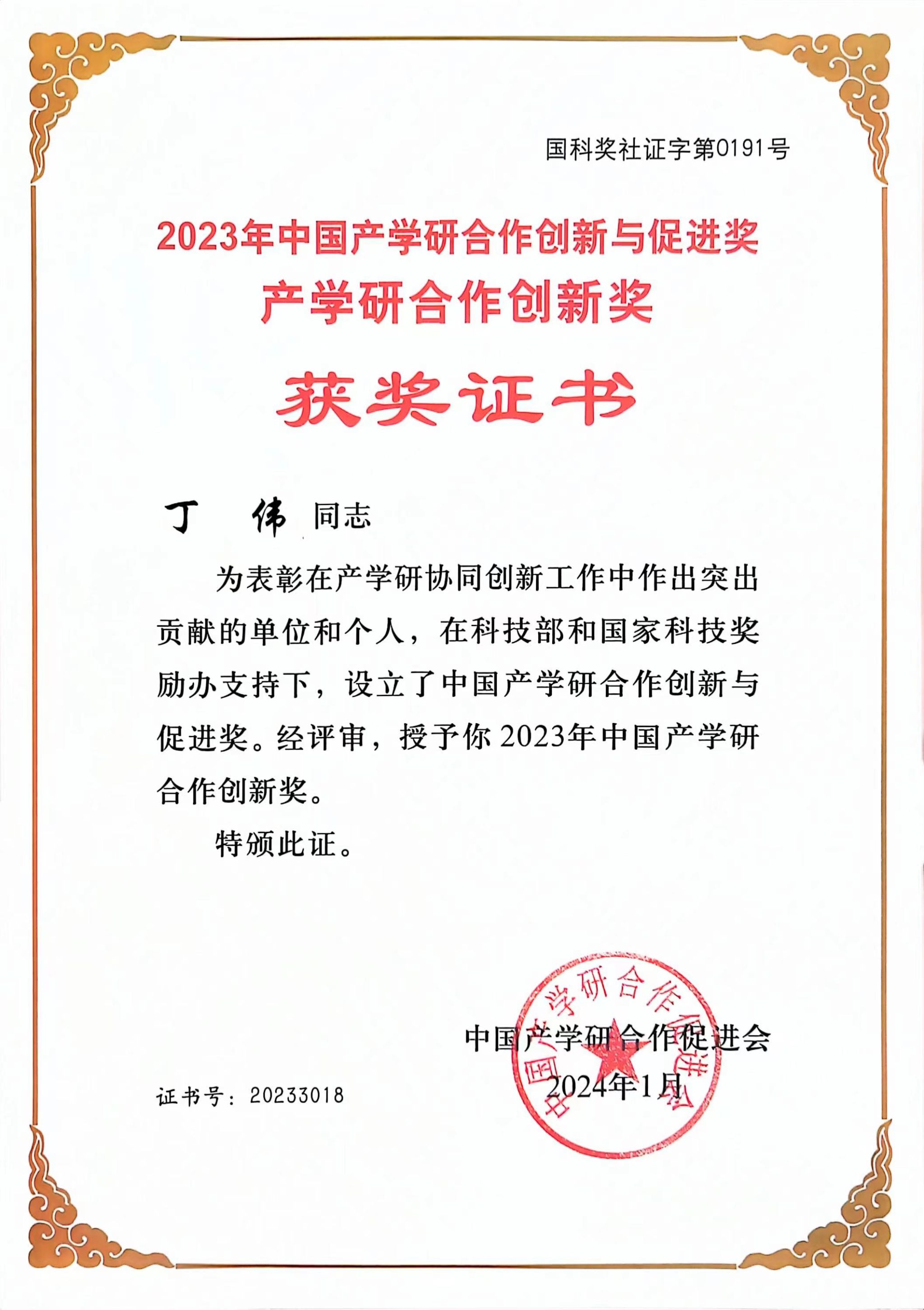 我院丁伟教授荣获中国产学研合作创新奖