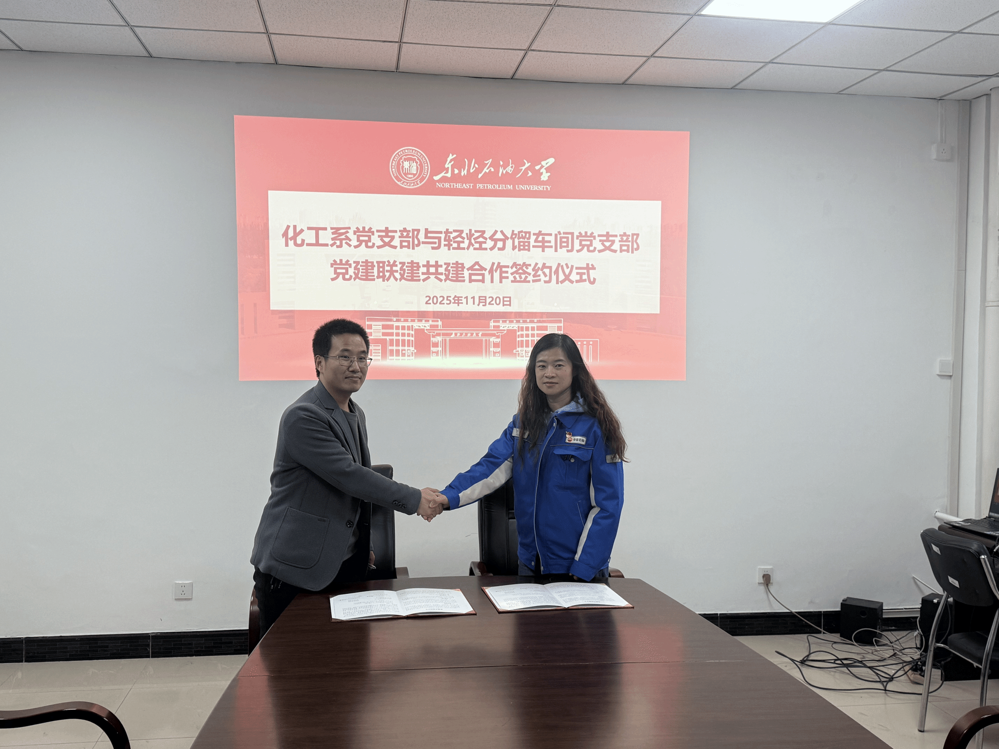 在签约仪式上,化工系党支部书记刘发堂、分馏车间党支部书记于雁雁分别介绍了各自党支部的基本情况,共同签署了《党建共建协议书》,并围绕协同育人、科研攻关与人才培养等核心议题展开深入交流,共同探索校企合作新路径,推动产学研深度融合,实现资源共享与优势互补。