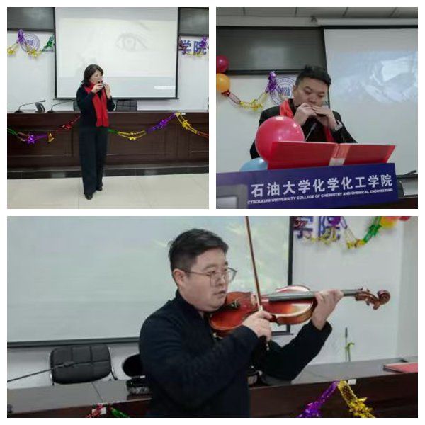 随后,精彩节目轮番上演。应化系教师以《相亲相爱的一家人》温情开唱,歌声中流淌着化院人团结一心、亲如家人的深厚情谊;化工系教师献上《光阴的故事》,悠扬旋律承载着奋斗岁月的温馨回忆。口琴、陶笛、小提琴等乐器相继奏响,展现了教职工的多才多艺与深厚情怀。