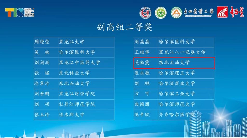 (通讯员 张微)5月8日下午,由黑龙江省教育厅主办的第二届黑龙江省高校教师教学创新大赛暨全国高校教师教学创新大赛选拔赛(龙江赛区)圆满落幕。我院关淑霞老师荣获副高组二等奖。